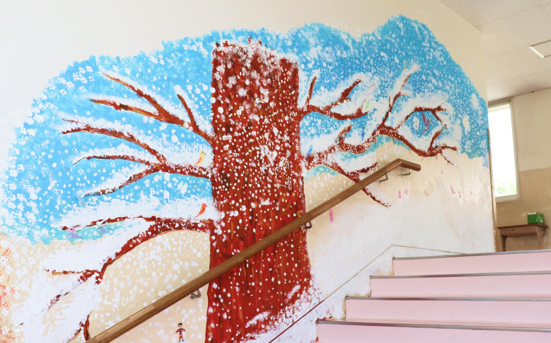 岩崎先生幹や枝は子どもたちが、葉は「校舎思い出参観日」に保護者の方と一緒に描きました。葉の部分を手形で色づけするために、保護者の方にローラーで子どもたちの手に色を塗ってもらったり、高い所は肩車をしてもらって色をつけたりしました。また、子どもたちが失敗して色をつけてしまった部分を、絶妙なフォローで修正し仕上げていただいた場面もあり、保護者の皆様と一緒に特別な思い出をつくることができました。完成した作品には、倭の思い出がたくさんつまっています。四季のサクラの木だけでなく、虫や鳥、羊、友達がたくさん描かれています。春は桜の下で全校お花見給食、若葉が輝く校庭での運動会、進む紅葉を感じながらの全校マラソンや豚汁作り、そして深い雪に覆われた校庭での雪遊びやクロススキー、移り行く季節を子どもたちは肌で、心で感じながら倭の地で過ごしてきたことを改めて感じました。