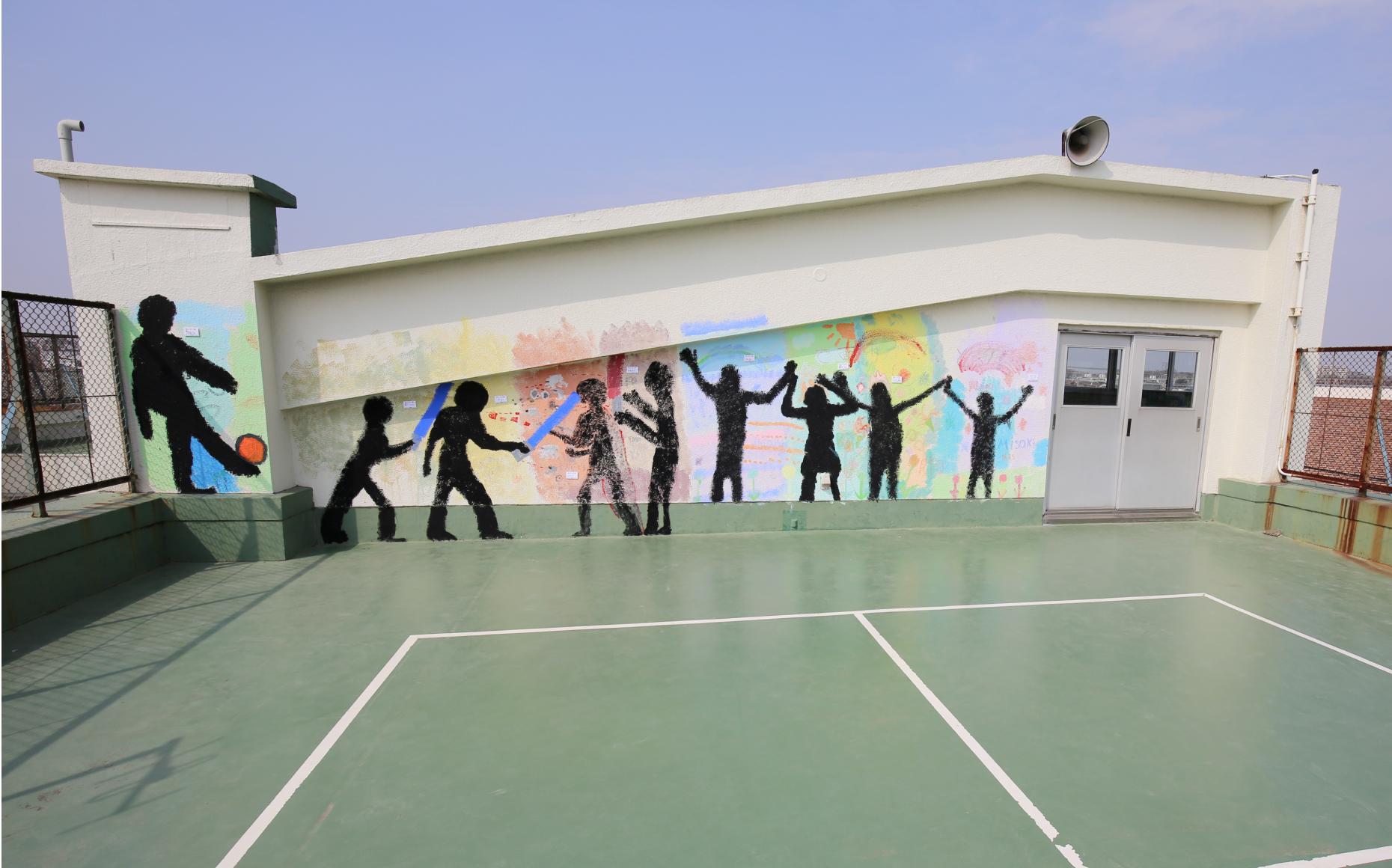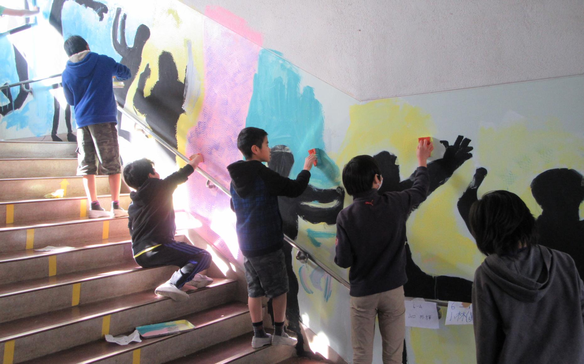 菅原先生誰もいなくなる校舎に子どもたちの姿が残るようにしたいと思いました。校舎に落書きではなく、作品として体全体を使って楽しんで描いてほしいと願いました。色は、一人5色に限定し、色を選ぶことでじっくりとどんな作品にしたいかを考えさせるようにしました。子どもたちにお互いの姿を描かせることでコミュニケーションを図らせたいという思いがあり、実際楽しそうにやっているのを見て嬉しかったです。