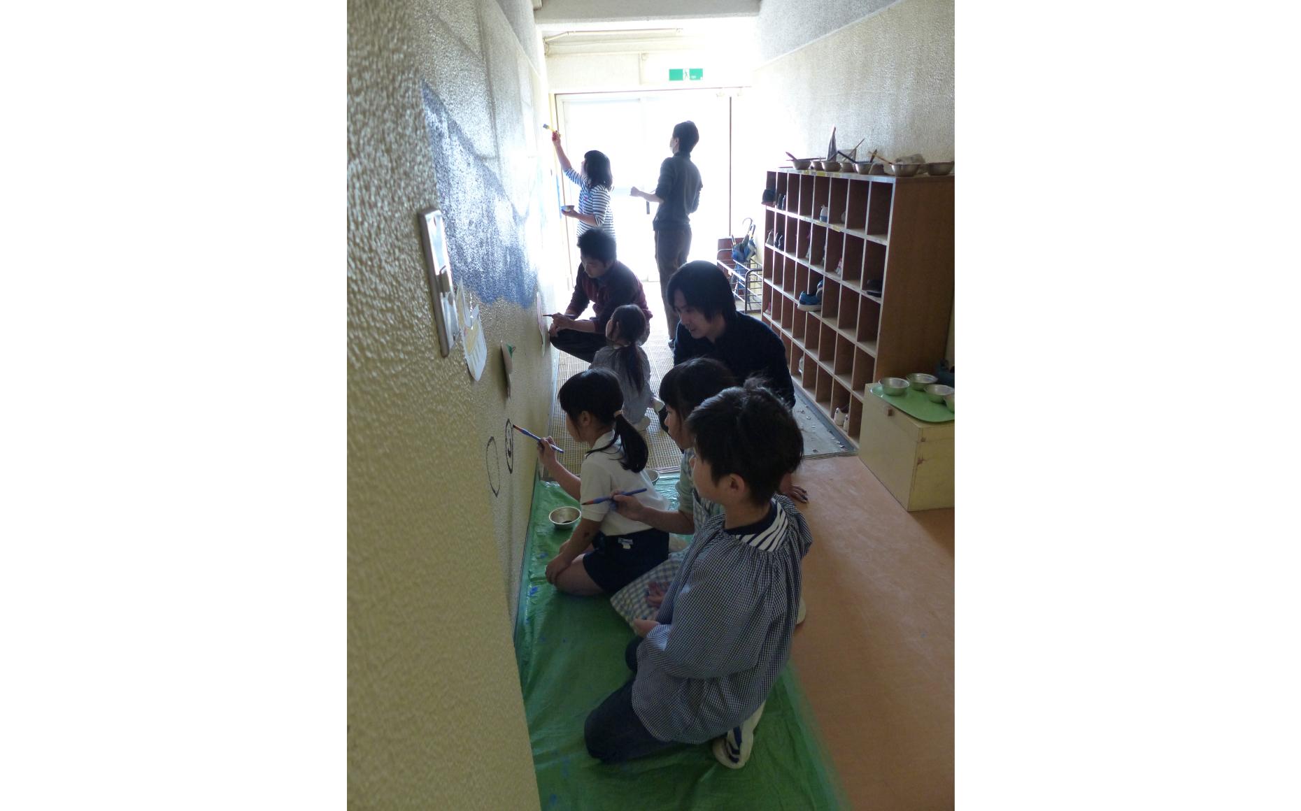 佐藤校長先生最初の一筆めは、こわごわといった子もいましたが、一度描いてしまえば、後はのびのび楽しんで描いていました。とにかく、1年生から6年生まで、楽しそうに描いていました(実際、「楽しい!」と言っていました)。 テーマを決めて描いていたので、いたずら書きにはならず、とにかく、みんなで共同作品を作るんだという意識をもって描いていました。「本来描いてはいけない場所」に描くという非日常的なスリル感だけでなく、そんな共同制作の楽しみもあったように思います。