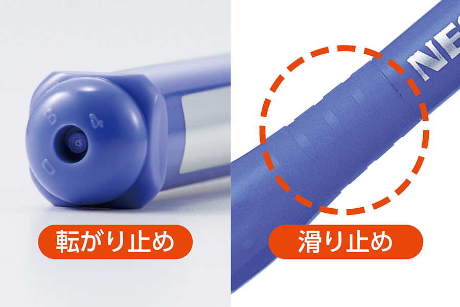使いやすさにこだわり、軸の後端には机に置いた時の落下を防ぐ「転がり止め」付き。軸の持ち手には手ブレを防ぐ「滑り止め」のスリットが加工されています。