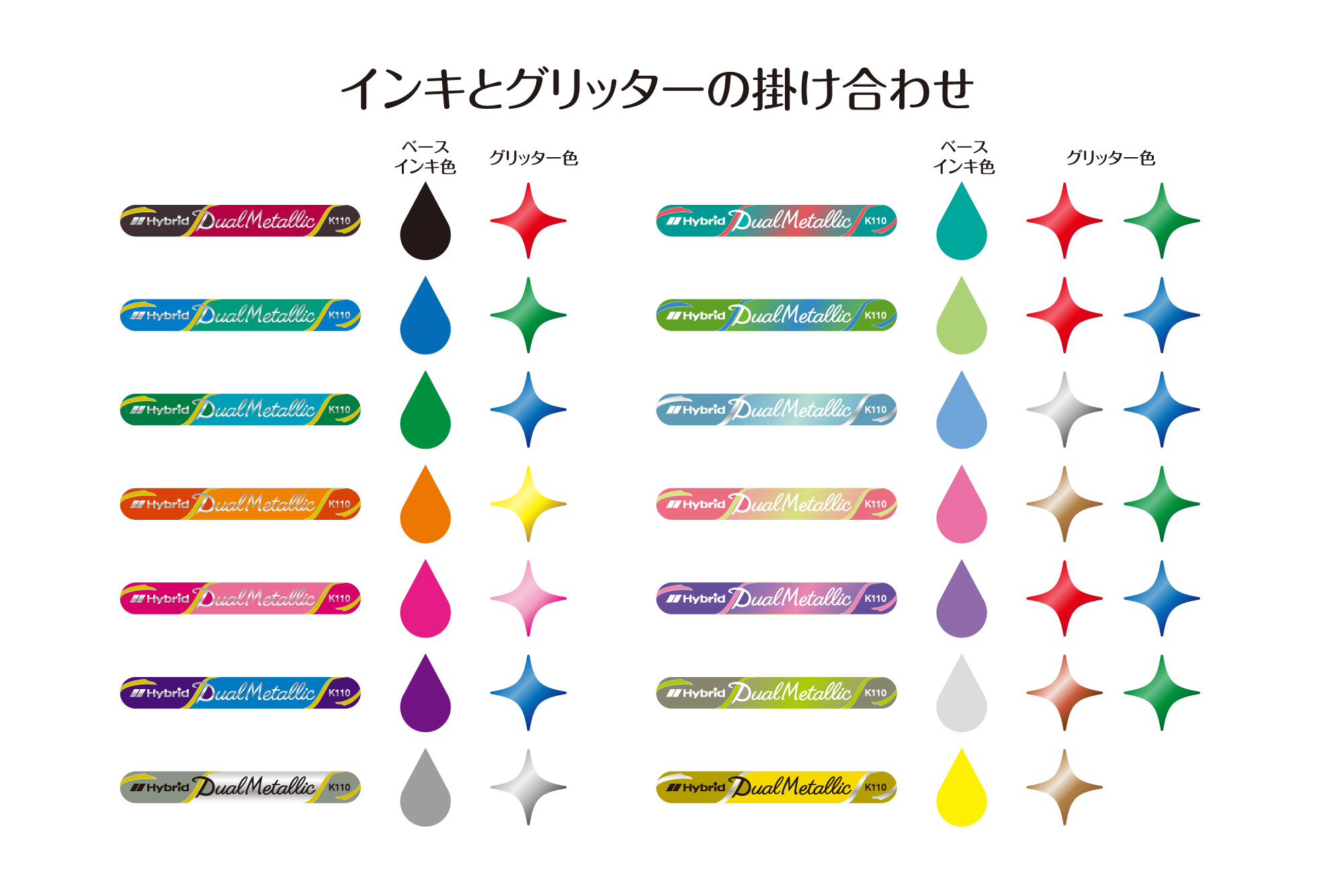 ※「ピンク+メタリックピンク」「シルバー」「ゴールド」は、同じ色の「インキ色」と「グリッター色」を採用しています。
