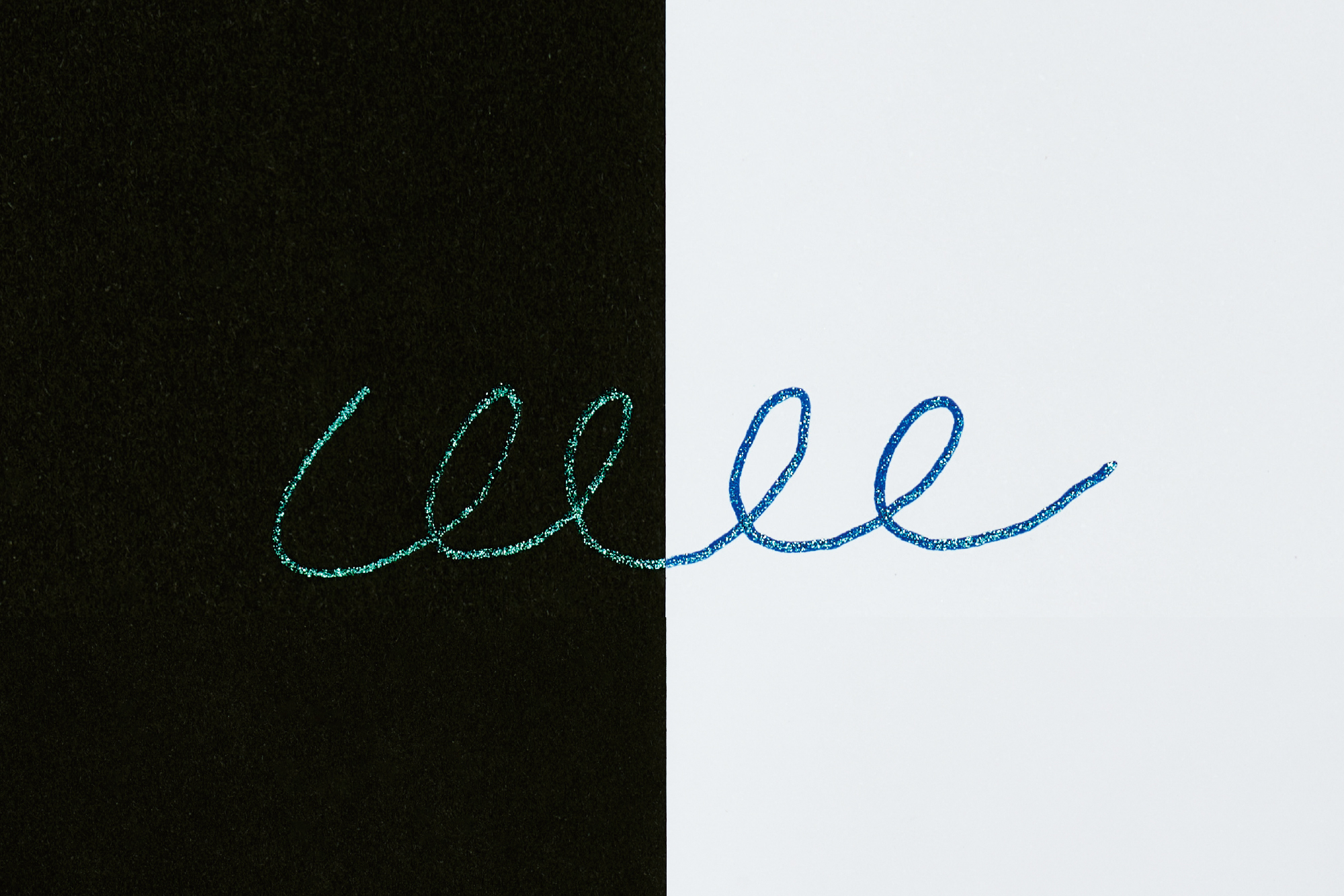 鮮やかな発色の染料と、グリッター顔料を異なる色同士で組み合わせているため、見る角度や紙の色に応じて色の見え方が変わります。白い背景ではインキの色が鮮やかに、黒い背景ではグリッターの色が際立ちます。