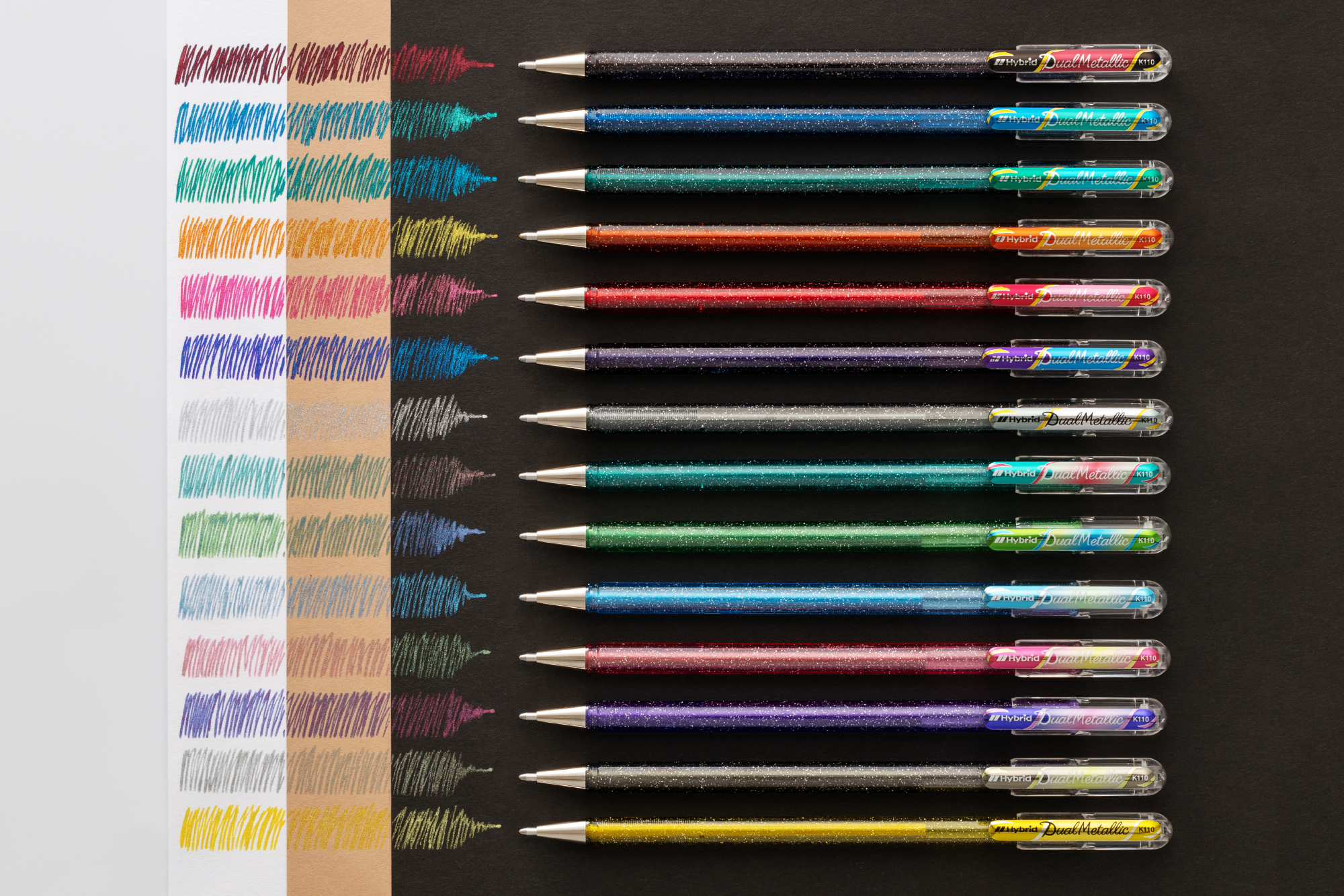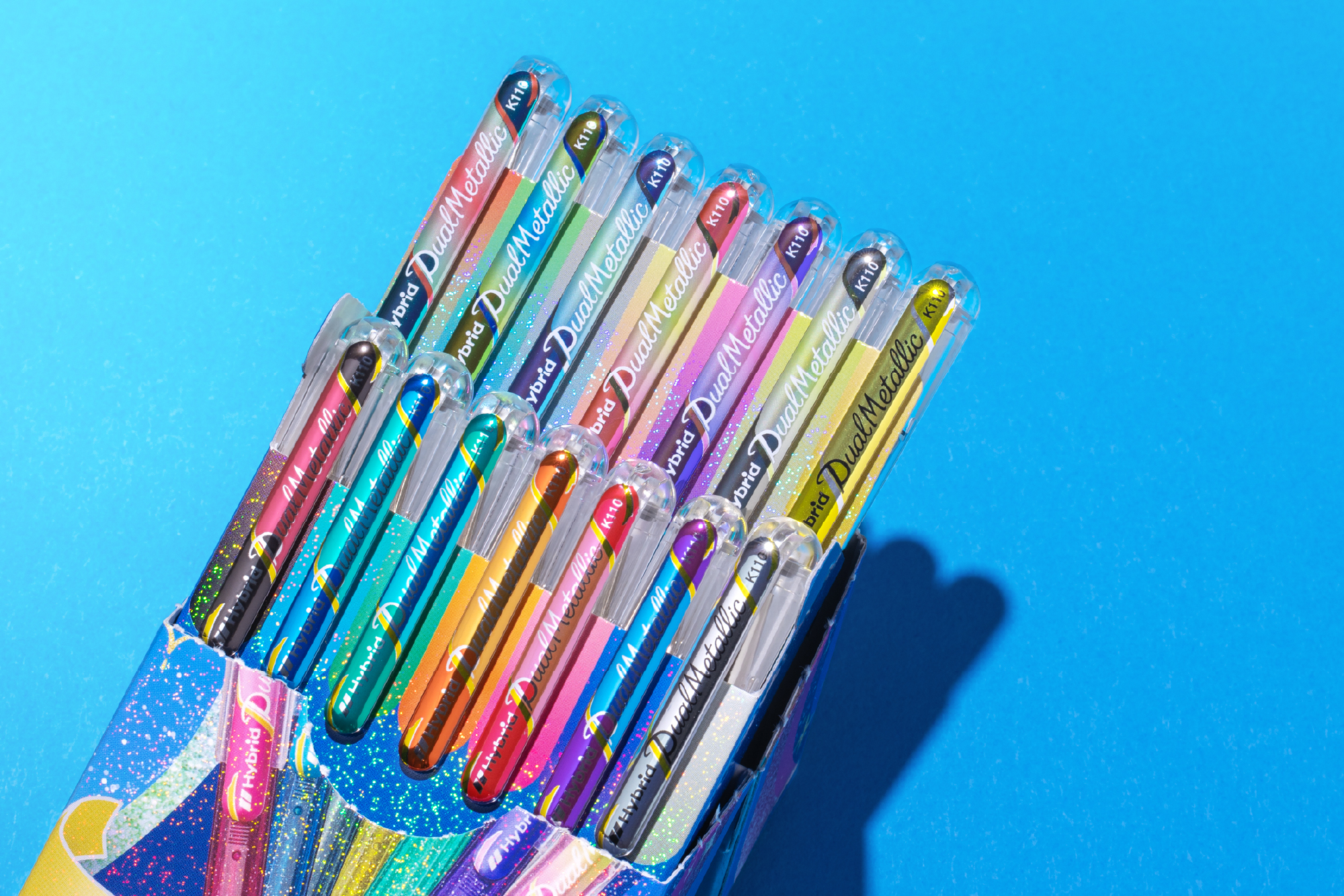角度と紙の色で見え方が変化し二重の色彩できらめく、 グリッター入りボールペン「デュアルメタリック」14色が新発売 5回の限定発売を経て、待望の定番化 ノートやイラスト、推し活グッズをグリッターインキが華やかに彩る