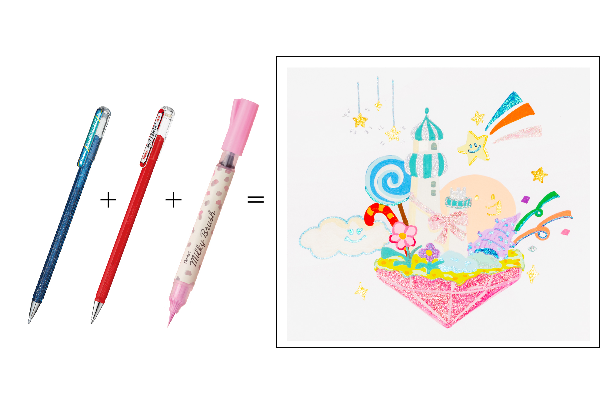 インクトピアシリーズ(Inktopia Series)とは、「Ink(インク)」と「Utopia(理想郷)」を組み合わせたシリーズ名で、「デュアルメタリック」「ミルキー」「マットホップ」の3種類から成る、ぺんてるのカラフルで個性的なインキシリーズです。本シリーズでは、今回発売する角度や紙の色によって色の見え方が変わる「デュアルメタリック」の他に、既にご好評いただいているパステル調でありながら濃厚な発色を特徴とする「ミルキー」、エネルギッシュで鮮烈な色彩を放つ「マットホップ」の3種類を「インクトピアシリーズ」として打ち出していきます。インクトピアシリーズを使うことで、何気ない日常も豊かに彩り、色ときらめきで心を満たしてどこまでも広がるハッピーな表現世界を届けます。それぞれが独自の特徴的な個性を持ちながらも、組み合わせ次第で表現の幅が広がり、描く人の創造力を刺激する「インクトピアシリーズ」を拡充してまいります。