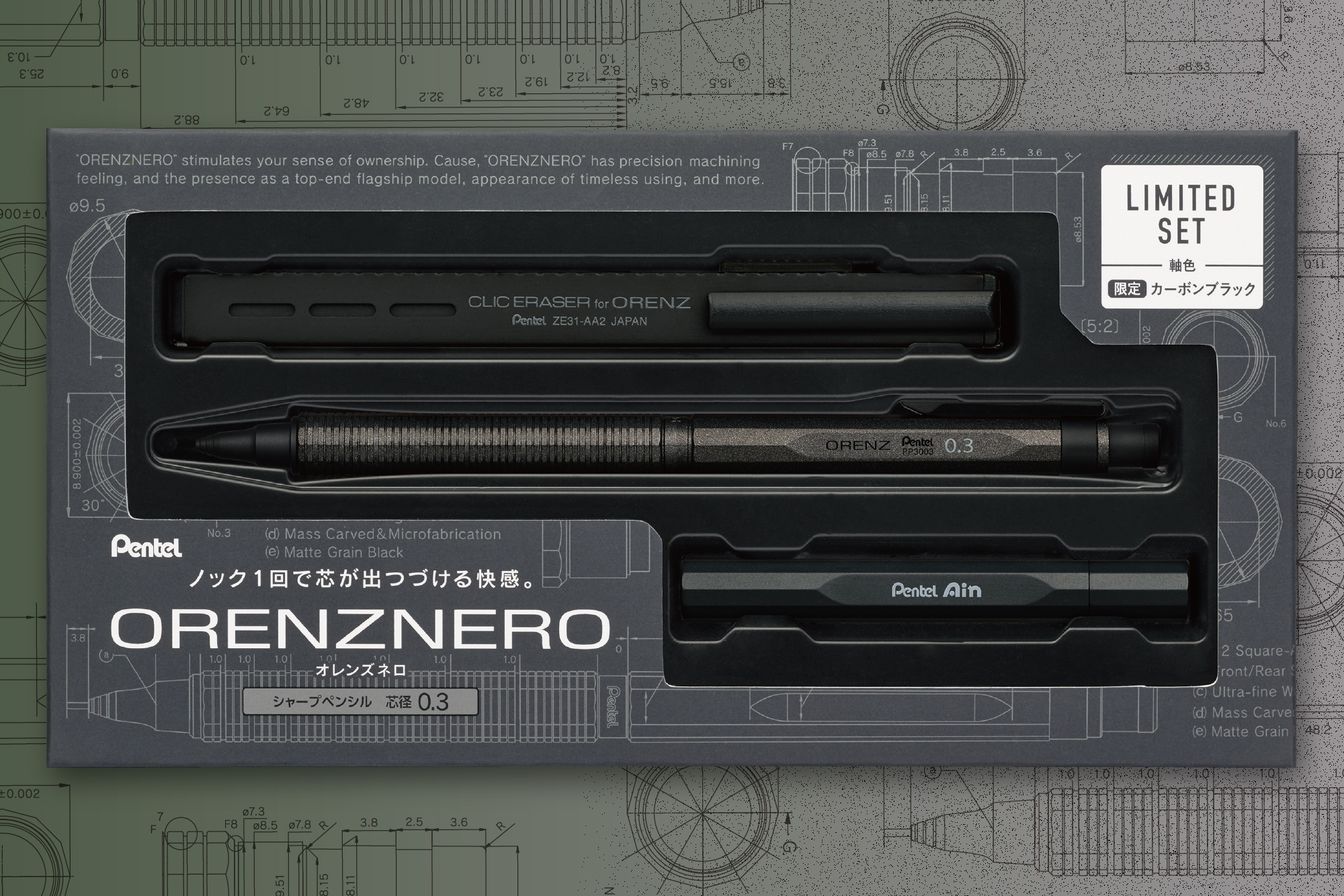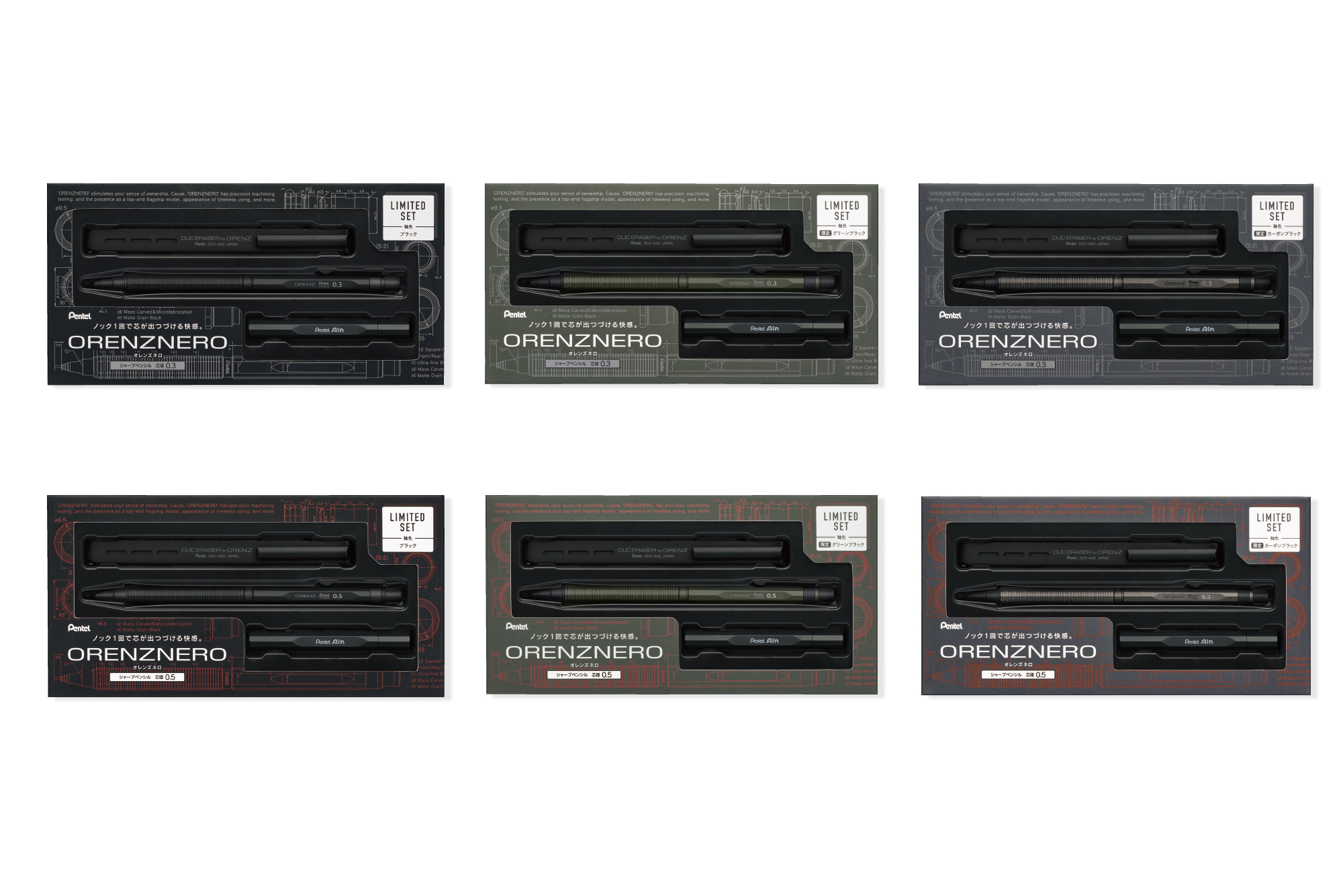 限定セットは3色(ブラック/グリーンブラック/カーボンブラック)それぞれに、0.3mmと0.5mmの2種類の芯径を展開しており、6種類のバリエーションから、自分の好みに合った一本をお選びいただけます。