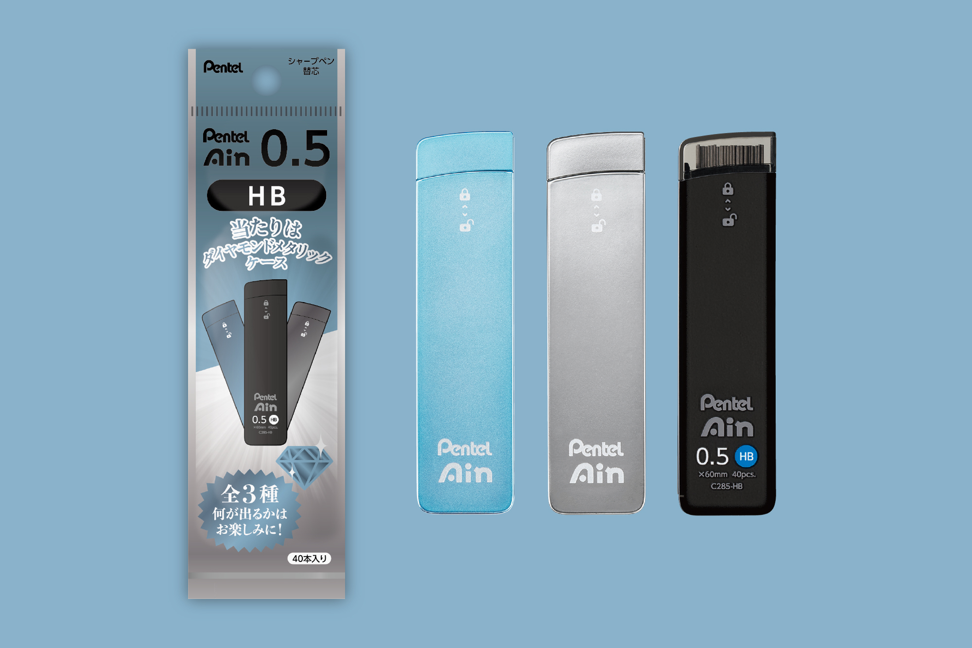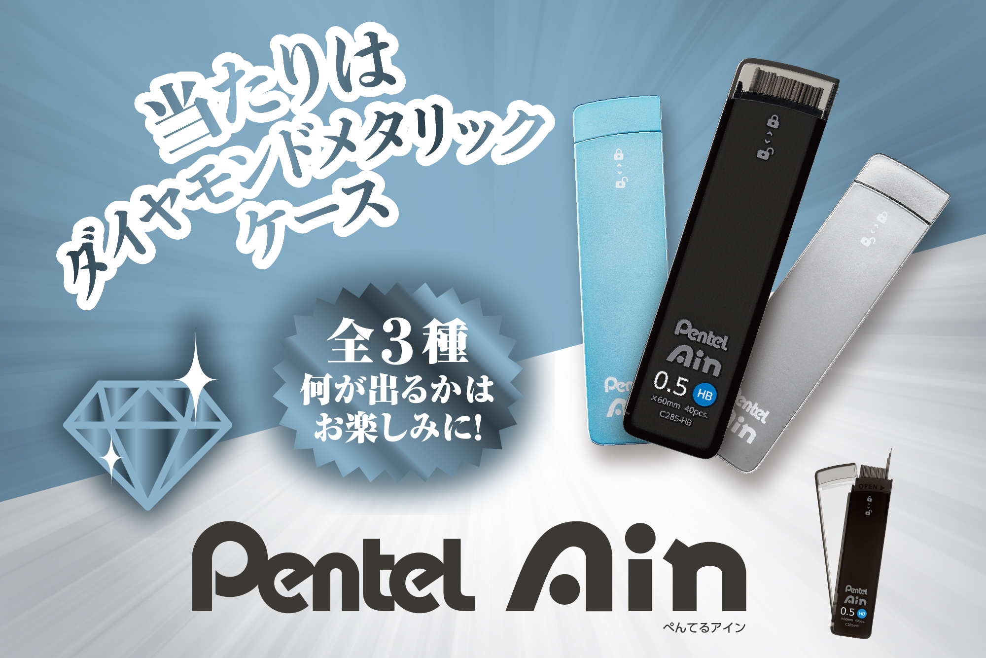 ※全3種類 ブルーダイヤモンドメタリックの限定ケースのPentel Ain(0.5/HB)、ダイヤモンドメタリックの限定ケースのPentel Ain(0.5/HB)、ブラックのケースのPentel Ain(0.5/HB)のいずれかが入っています。
