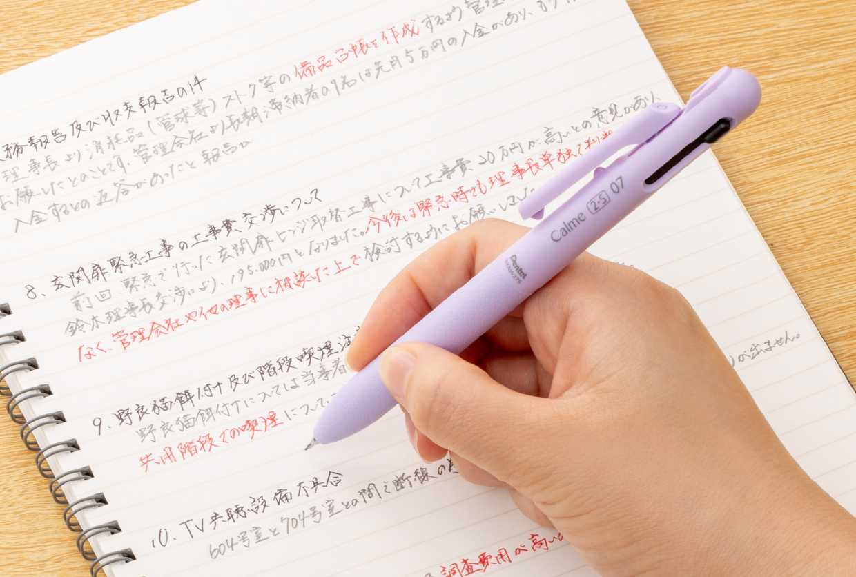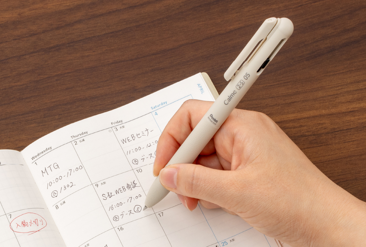 ボールペンの「カチカチ」というノック音。多くの人が気になっていたこの音をカルムは大幅に低減しました。その上ノック感もソフトで優しい。「書くこと」に向き合い、考え抜かれた設計で日々の筆記をそっと支えます。