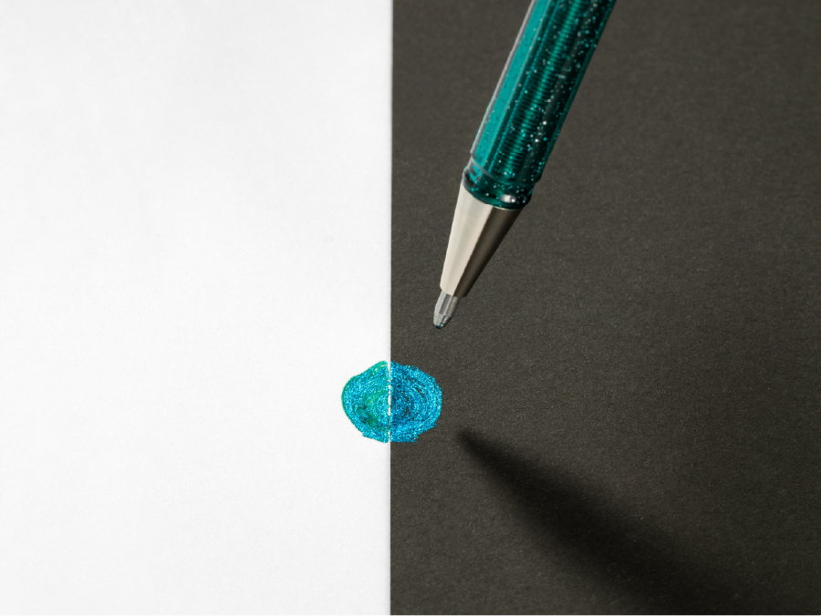 鮮やかな発色の染料と、グリッター顔料を異なる色同士で組み合わせているため、見る角度や紙の色に応じて色の見え方が変わります。