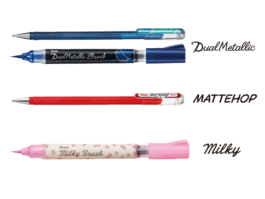 インクトピアシリーズ(Inktopia Series)とは、「Ink(インク)」と「Utopia(理想郷)」を組み合わせたシリーズ名で、「デュアルメタリック」「ミルキー」「マットホップ」の3種類から成る、ぺんてるのカラフルで個性的なインキシリーズです。