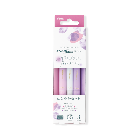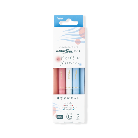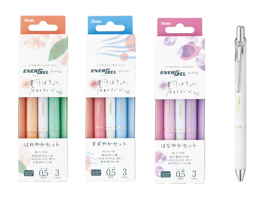 単品の他に、ソフトカラー2色と日常で最も使用頻度の高い黒インキを組み合わせた3本セットを3種類発売します。用途に合わせて色を使い分けられるバランスの良いラインアップで、黒インキの軸色にはセット限定デザインの「絹空」を採用しました。