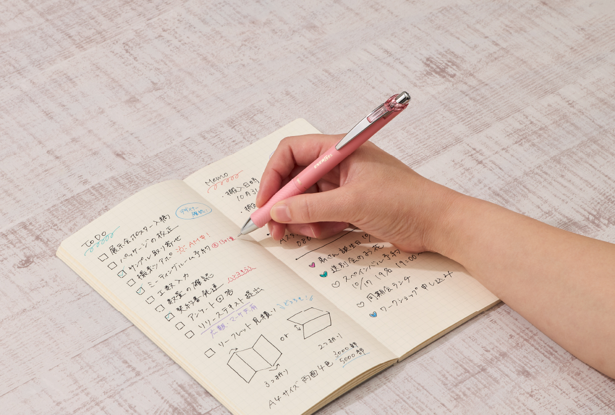 エナージェル史上初となる穏やかな色合いの「ソフトカラー」は、黒インキとの合わせ使いを想定したカラーラインアップです。資料への書き込みから手帳の見出しまで、柔らかい色味でありながら、文字としての視認性にも配慮した鮮やかな発色で、筆跡を優しく彩ります。インキ名には、自然の中にある美しさや温かみをイメージした名前を採用しました。