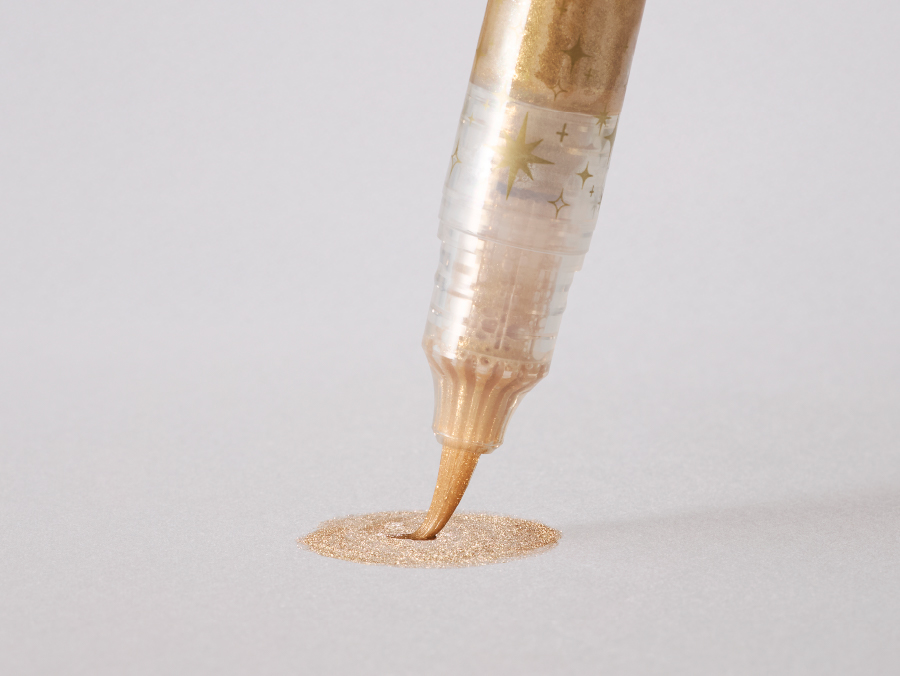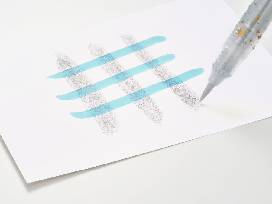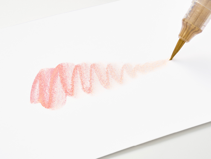 カラーペンの上に重ねても、下地の色を生かし、グリッターの繊細な輝きを加えた華やかな筆跡になります。