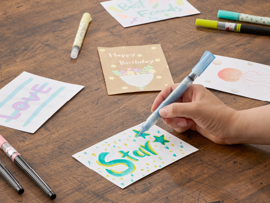 マーカーやカラー筆ペン、ボールペンで描いた筆跡の上から描き足すことで、より華やかになります。