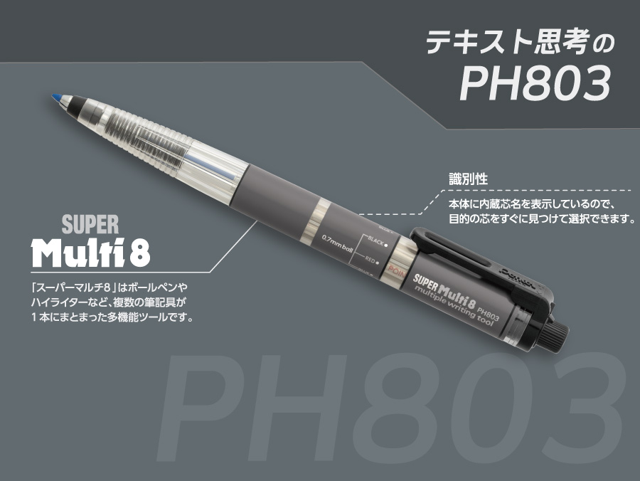 ボールペンやハイライターなど複数の筆記具が1本にまとまった「スーパーマルチ8(PH803)」は、アイデア・情報を文章や言語情報で捉えて整理する、テキスト思考派におすすめ。