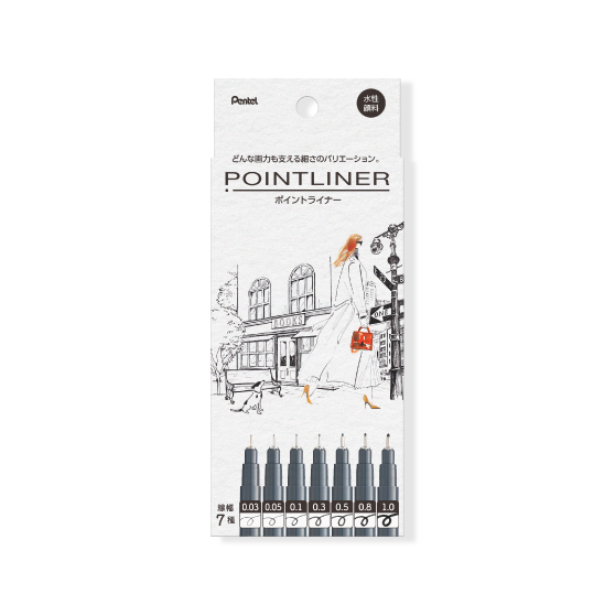 ミリペンの中でも基本の線幅であり、細描きから太描きまで対応できる0.03、0.05、0.1、0.3、0.5、0.8、1.0の7種類。繊細な線で描き込みたいときも、大胆に力強い線を引きたいときも、これ1シリーズで表現が可能です。