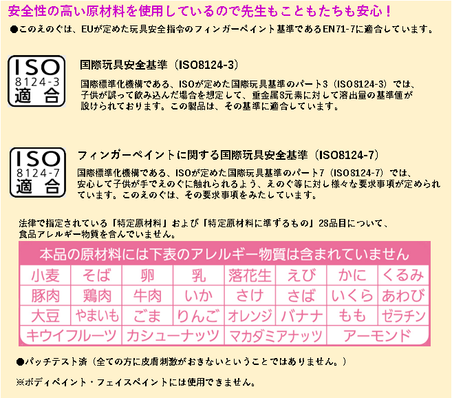 なお、本製品は、欧州玩具安全指令EN71-3の基準を満たす配合です。EN71-3では、子供が誤って飲み込んだ場合を想定して、重金属19物質(17元素)に対して、溶出量の基準値を設けています。19物質(17元素)とは、国際玩具安全性基準ISO8124-3が定める8元素の重金属(カドミウム、鉛、水銀、クロム、バリウム、ヒ素、アンチモン、セレン)のほかに、アルミニウム、ホウ素、コバルト、銅、マンガン、ニッケル、スズ、ストロンチウム、亜鉛のことを指します。