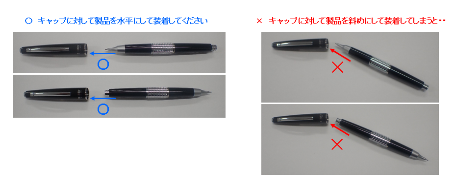 ※ペン先や、ペン後端のノック部分などがキャップ内の部品に接触すると、ペン先へのキズや、キャップ内側の部品の位置がずれてしまう場合があります。